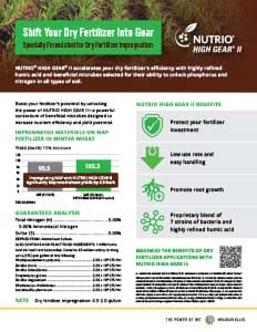 NUTRIO® HIGH GEAR® II accelerates your dry fertilizer’s efficiency with highly refined humic acid and beneficial microbes selected for their ability to unlock phosphorus and nitrogen in all types of soil.